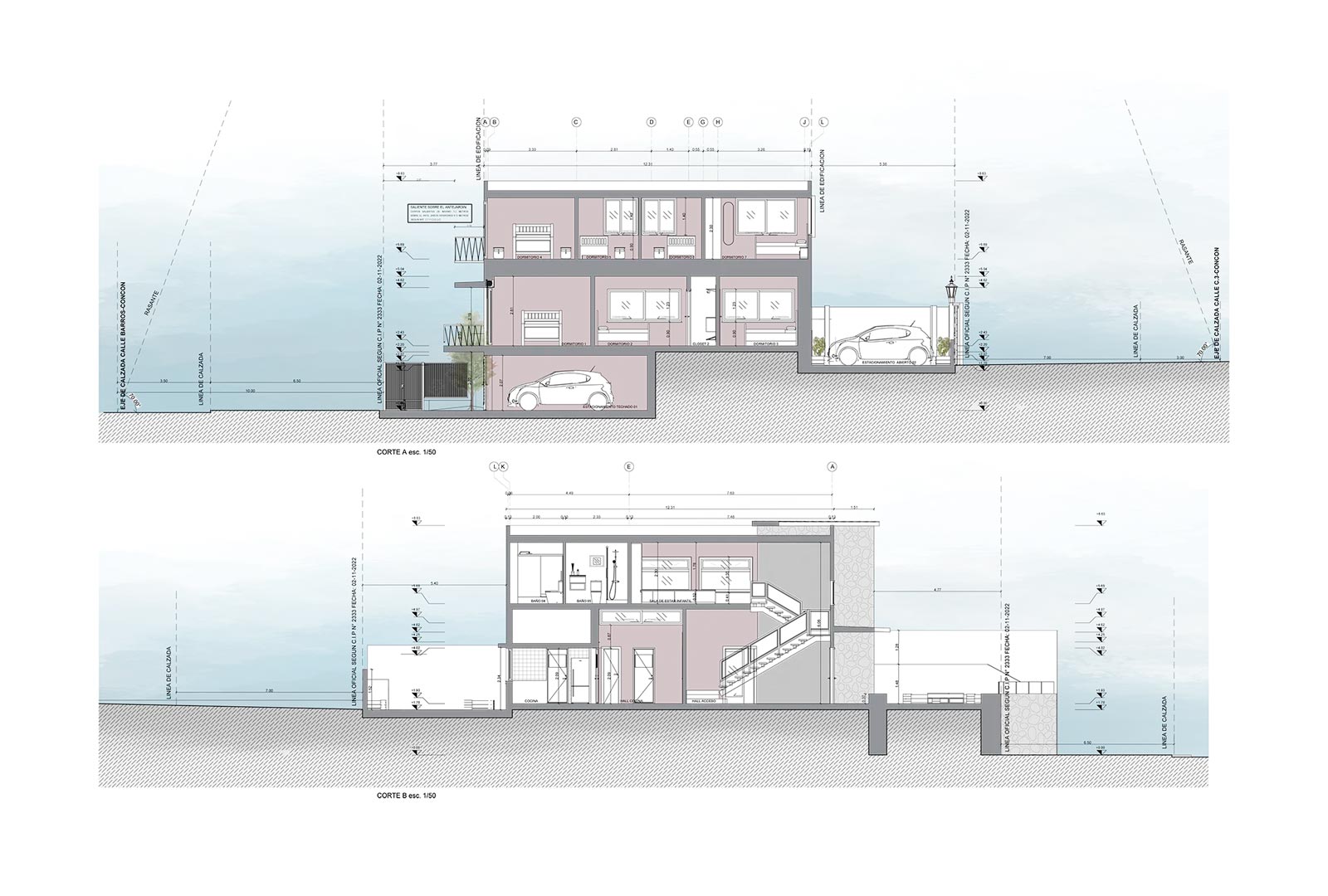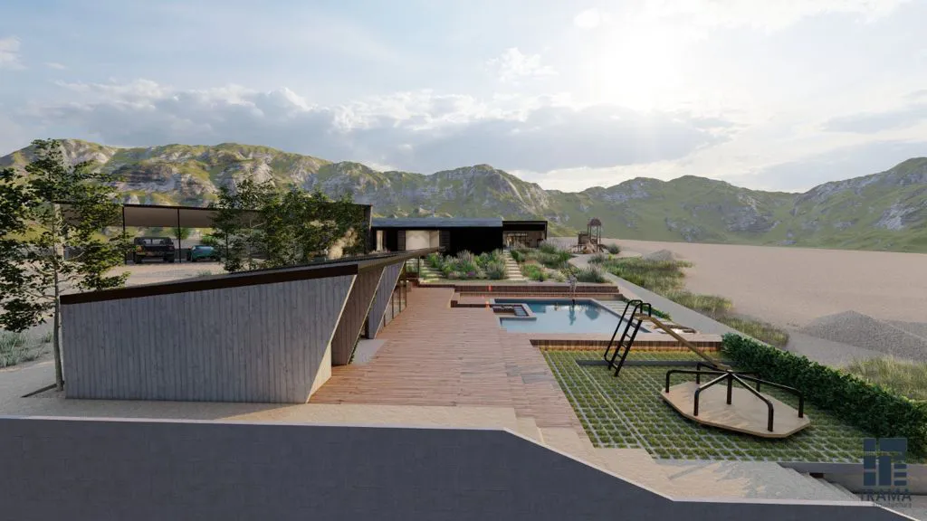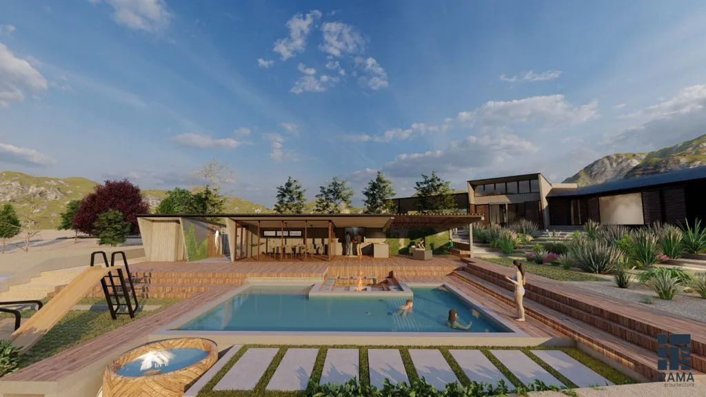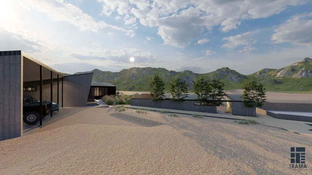 Masterplan en terreno de 5.500 m2 para construcción por etapas. La vivienda se emplaza en la cota más alta, orientada hacia el valle, con un núcleo de servicios en hormigón armado y alas de dormitorios ampliables proyectadas en estructura metálica y revestimiento microacanalado en muros y techumbre.